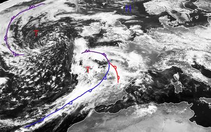 Die Ausläufer des Tiefs 'Fei' über Nordspanien bringen auf der Iberischen Halbinsel und im westlichen Frankreich dichte Wolken und einige Schauer und Gewitter. Auch sonst herrscht in Mitteleuropa leichter Tiefdruckeinfluss vor, so dass neben Sonne auch Wolken durchziehen. Etwas weniger ist die Bewölkung in Norddeutschland unter dem Einfluss von Hoch 'Otto' über dem Nordmeer. Tief 'Fei' verlagert sich nun langsam nach Nordosten und wird bis Sonntag Deutschland mit Schauern, Gewittern und teils auch Regen erreichen. (Bildquelle: Copyrigt EUMETSAT, NERC Satellite Receiving Station, University of Dundee)