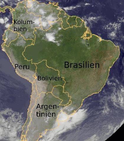 Brasilien zeigt sich heute ebenso wie Bolivien und Peru häufig wolkenlos. Gewitterwolken haben sich aber vereinzelt im Amazonasbecken und nördlich davon gebildet. Im äußersten Südens Brasiliens befinden sich einige dichtere Wolken, die auch über Uruguay und an der Ostküste von Argentinien teils kräftigen Regen bringen. Wolken und kräftiger Regen ziehen vom Süden Brasiliens nun etwas weiter nach Norden.