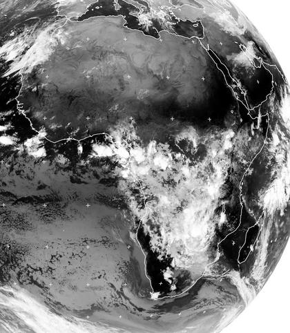 Vor allem über der Südhälfte Afrikas findet man jetzt die Bewölkung von tropischen Schauern und Gewittern. Im Norden ist es dagegen mittlerweile weitgehend wolkenlos oder nur gering bewölkt. Ein leichter Tiefausläufer kann aber ein paar Wolken mit einzelnen Schauern nach Marokko bringen. (Bildquelle: NERC Satellite Receiving Station, Dundee University, Scotland, http://www.sat.dundee.ac.uk/)