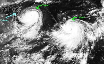 Im Westpazifik ziehen zur Zeit zwei Taifune ('Talim' und 'Nabi') von den Marianen nach Westen auf Südostchina zu. 'Talim' erreicht zur Zeit Windgeschwindigkeiten von 250, in Böen 305 km/h und soll Berechnungen zufolge am Freitag Taiwan erreichen. 'Nabi' erreicht zur Zeit nur Windgeschwindigkeiten von 90, in Böen 120 km/h, in den nächsten Tagen soll er sich aber noch verstärken und Windgeschwindigkeiten von 215 bis 260 km/h erreichen. Sein Endziel ist noch unklar.