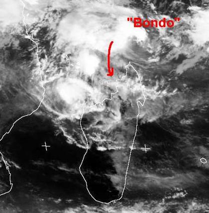 Der Zyklon 'Bondo' über den Seychellen hat sich etwas abgeschwächt, und erreicht jetzt nur noch mittleren Windgeschwindigkeiten von 166, in Böen 204km/h. Allerdings hat er seine Zugrichtung nach Südwesten verlagert. Berechnungen zufolge soll er sich noch etwas abschwächen, und am Sonntag auf die Nordwestküste von Madagaskar treffen. (Bildquelle: NERC Satellite Receiving Station, Dundee University, Scotland, http://www.sat.dundee.ac.uk/)