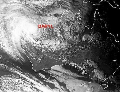Vor der Nordwestküste Australiens liegt der Zyklon Daryl mit Windgeschwindigkeiten von 120 km/h und Böen bis 150km/h. Er wird sich voraussichtlich etwas abschwächen und entlang der Küste weiter südwärts ziehen.