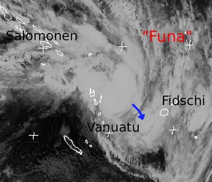 Der Zyklon 'Funa' hat nach der Saffir-Simpson-Skala mit Windgeschwindigkeiten von 120 km/h im Mttel und 150 km/h in Böen heute die Kategorie 1 erreicht. Er liegt am Donnerstag Mittag mit seinem Zentrum östlich von Vanuata. Seine Zugbahn verläuft nun mit einer Zuggeschwindigkeit von 22 km/h in südöstliche Richtung weiter, dabei soll er sich noch etwas weiter verstärken. Vor allem die Fidschi-Inseln sind damit in den nächsten Tagen neben starken Wind auch durch kräftige Niederschläge bedroht. (Bildquelle: NERC Satellite Receiving Station, Dundee University, Scotland, http://www.sat.dundee.ac.uk/)