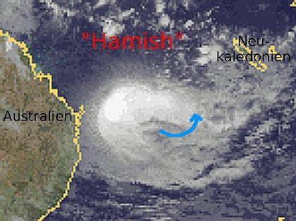 Der Zyklon 'Hamish' hast sich seit gestern von der Küste Australiens entfernt und verschont somit die Küstengebiete nach Süden hin und auch Brisbane. Bei Windgeschwindigkeiten von 120 km/h im Mittel und bis 205 km/h in der Spitze hat er auch etwas an Kraft verloren. 'Hamish' zieht nun auf Neukaledonien zu, wird sich aber weiter abschwächen. Wenn der Wirbelsturm voraussichtlich am Mittwoch die Inselgruppe erreicht, sind aber weiterhin starke Regenfälle zu erwarten.