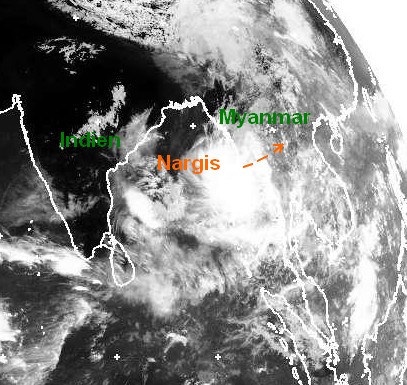 Der Ausschnitt zeigt Zyklon „Nargis“ über dem Golf von Bengalen, er erreicht heute mit Windgeschwindigkeiten von 200, in Böen bis zu 260 km/h die Südküste von Myanmar nahe der Hauptstadt Yangon. Neben Orkanböen muss auch mit kräftigen Regenfällen und Überschwemmungen gerechnet werden. (Bildquelle: NERC Satellite Receiving Station, Dundee University, Scotland, http://www.sat.dundee.ac.uk/)