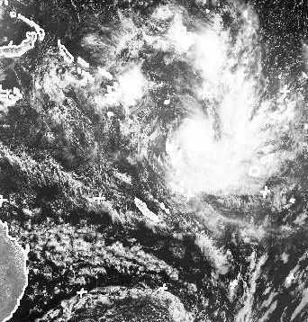 Östlich von Vanuatu liegt der neue Zyklon 'Xavier' mit mittleren Windgeschwindigkeiten bei 200 km/h. Er zieht langsam südwärts und streift dabei die Inseln. (Bildquelle: NERC Satellite Receiving Station, Dundee University, Scotland, http://www.sat.dundee.ac.uk/)