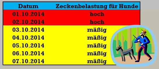 Erst ab dem Wochenende sinkt das Zeckenrisiko für den Hund deutlich. Dann trocknen die Böden zum Teil ab und die Nachttemperaturen fallen weiter ab.