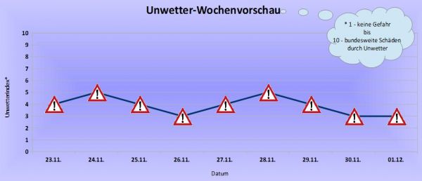 In der nächsten Wetterwoche bleibt uns das nasskalte Novemberwetter zum Großteil erhalten. Die aktuellen Prognosemodelle zeigen immer wieder Tiefausläufer, die von Nordwest nach Südost über das Bundesgebiet hinwegziehen, dabei fallen die Niederschläge bevorzugt im Süden und Osten, zeitweise aber auch über der Nordwesthälfte des Landes als Schnee. In den Nächten ist zudem verbreitet leichter Frost möglich, daher ist neben Schneeglätte, besonders morgens verbreitet auch mit überfrierender Nässe zu rechnen! An den Küsten und teils auch im übrigen Norddeutschland weht am Dienstag und voraussichtlich am Freitag ein teils stürmischer Wind.