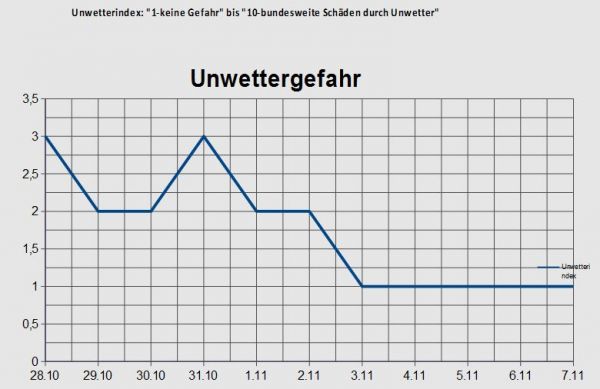 Die Gefahr durch Unwetter ist bis in den November hinein gering. Im Küstenumfeld weht zwar ein zeitweise frischer bis starker Wind mit vereinzelt stürmischen Böen, sonst bleibt es aber bei verbreitet ruhigem, trockenem und häufig freundlichem Herbstwetter.