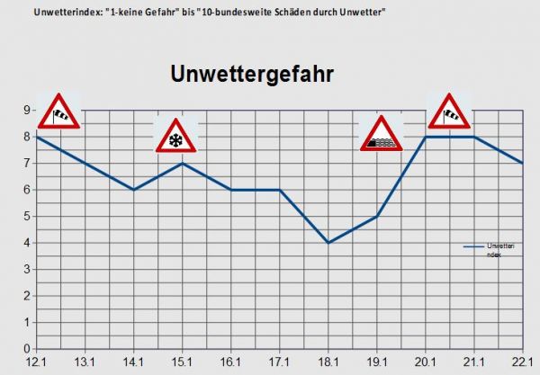 Der Start in die Woche beginnt zunächst mit landesweit sehr windigem Wetter, wobei selbst im Flachland mit teils stürmischen Wind zu rechnen sein wird. Auf den Bergen und an der See sind anfangs noch teils orkanartige Böen möglich. Zur Wochenmitte hin bleibt es recht windig und oft regnerisch, dabei gehen die Niederschläge im Osten und Süden und in höhren Lagen zum Teil in Schnee über. Nach Wochenmitte ziehen immer wieder kräftige Tiefausläufer mit jeder Menge Regen übers Land hinweg, was insbesondere bei kleinen und mittleren Flussläufen zu möglichem Hochwasserständen und somit zu regionalen Überschwemmungen führen kann.