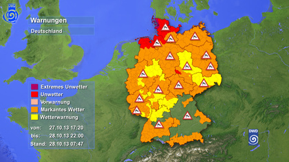 Für die Nordseeküste bestehen Unwetter-Warnungen, dort kann es orkanartige Böen über 110 km/h geben. Für Sylt gibt es sogar eine Warnung vor extremen Orkanböen um 140 km/h.