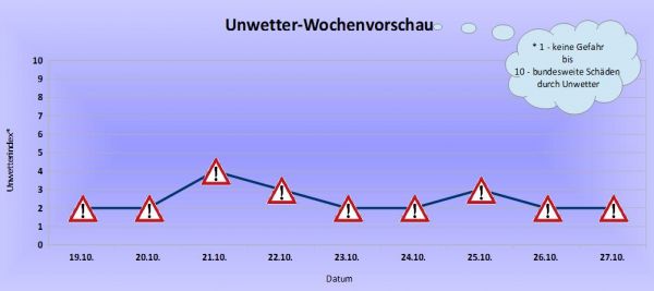 Bei der Unwetter-Vorschau ist für die kommende Woche insgesamt nur mit einer geringen Unwettergefahr zu rechnen. Es herrscht zumeist kühles und häufig auch nasses Herbstwetter. Am Mittwoch weht zumindest im Norden ein teils starker und an den Küsten auch teils stürmischer Wind, sonst bleibt es jedoch bei meist schwachem bis mäßigen Windverhältnissen. Bei weitgehend zweistelligen Höchstwerten sind auch keine Schneefälle zu prognostizieren.