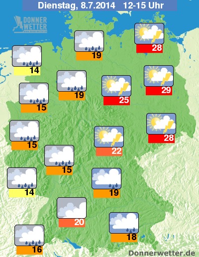 Die Temperaturgegensätze über Deutschland werden sich am Dienstag noch weiter verschärfen: Im Osten werden noch einmal bis zu 30 Grad erreicht, durch den Westen zieht kalte und vor allem feuchte Luft, so dass teilweise nur noch 12 bis 15 Grad möglich sind. Vor allem aber wird es im Westen immer wieder regnen, so dass größere Regenmengen zusammenkommen können.