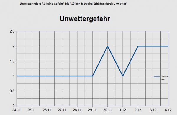 Die Unwettergefahr in Deutschland bleibt auch weiterhin gering, denn bei einer überwiegend langsamen Südostströmung herrscht verbreitet ruhiges, teils trübes, teils freundliches Herbstwetter. Nur in Küstennähe ist tageweise mit starkem Wind und stürmischen Böen zu rechnen. Ein richtiger Wintereinbruch ist kurzfristig ebenfalls nicht zu erwarten, jedoch wird es an den kommenden Tagen insgesamt etwas kühler, so dass in der Nacht regional Nachtfröste, mit einhergehender Glättegefahr, auftreten werden. Schneefälle bleiben aber auch weiterhin mehr oder weniger auf die Hochlagen der Mittelgebirge und die Alpen beschränkt.