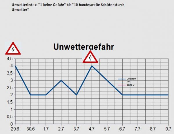 Die Gefahr durch Unwetter bleibt in der kommenden Wetterwoche zum weitaus größten Teil gering. Am Montag sind jedoch im Norden und Osten gebietsweise Gewitter möglich. Im weiteren Wochenverlauf bleibt es dann voraussichtlich weitgehend ruhig, bevor es zum Wochenende über weiten Teilen Deutschlands schwül und gewittrig werden kann. Ab Sonntag nimmt die Gewitterneigung, nach den derzeitigen Modellläufen, wieder ab.