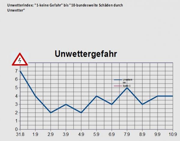 Die Gefahr durch mögliche Unwetter ist besonders zu Beginn der neuen Woche oft hoch, dabei sind bei noch verbreitet schwülheißen Temperaturen vielerorts kräftige Schauer und Gewitter möglich. Zum Start in den September, am Dienstag dürfte sich die Wetterlage jedoch schon deutlich entspannt haben und es besteht nur noch eine geringe, im weiteren Wochenverlauf wieder eine geringfügig steigende Gewittergefahr.