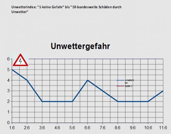 Im Laufe der Woche besteht besonders am Montag, aber auch am Dienstag und am Samstag ein oft mäßiges und zeitweise auch großes Gewitterrisiko. Im übrigen Zeitraum bleiben die Gefahren durch Gewitter jedoch weitgehend gering.