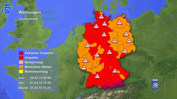 Weiterhin besteht für weite Teile Deutschland eine Unwetterwarnung. In exponierten Höhenlagen, etwa im Harz und im Alpenvorland warnt der DWD aktuell sogar vor extremem Unwetter.