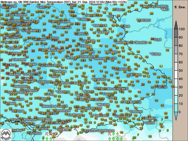 Die Karte zeigt die GFS-Prognose für Bayern und den Alpenraum am Samstagnachmittag. Die Temperaturwerte sind ein bisschen mau, auf dem Wiesengelände liegen die tatsächlichen Temperaturen im Jahrmarkt-Mikroklima aber um einige Grad höher.