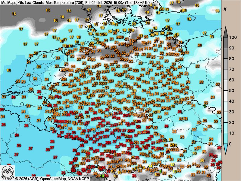 Die Wetterkarte mit Lufttemperaturen und Bewölkung für Freitag, 15:00 Uhr: