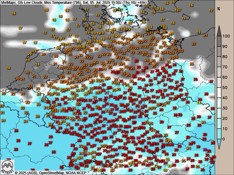 Die Wetterkarte mit Lufttemperaturen und Bewölkung für den morgigen Samstag, 15:00 Uhr: