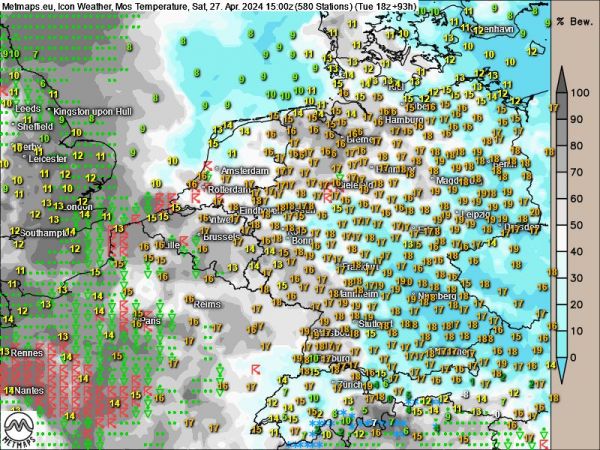 Die Karte zeigt die zu erwartenden Temperaturen nach ICON am kommenden Samstag - das aktuelle Temperaturniveau verdoppelt sich nahezu, verbreitet steigen die Temperaturen auf Werte um 17 bis 18 Grad; im äußersten Osten und am Oberrhein sind gebietsweise auch 19 oder sogar 20 Grad möglich.