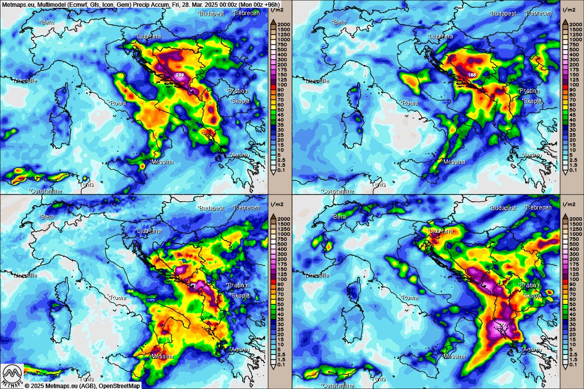 Mit Regenmengen bis zu 300 l/m² binnen 72 Stunden sind zunächst vor allem Kroatien, Serbien und Albanien betroffen; ab Mittwoch weiten sich die Niederschläge dann auch über allen anderen Balkanländern aus, eventuell auch über dem Norden Griechenlands.