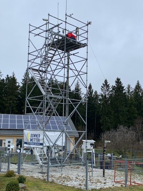 Unsere Arbeitswoche geht heute mit einem Außeneinsatz zu Ende: Karsten Brandt und Michael Hoffmüller-Klein befinden sich aktuell in schwindelerregender Höhe (genau genommen sind es etwa 10 Meter), um frische Technik an unserem Messturm im donnerwetter.de-Wetterpark in Hellenthal zu installieren.