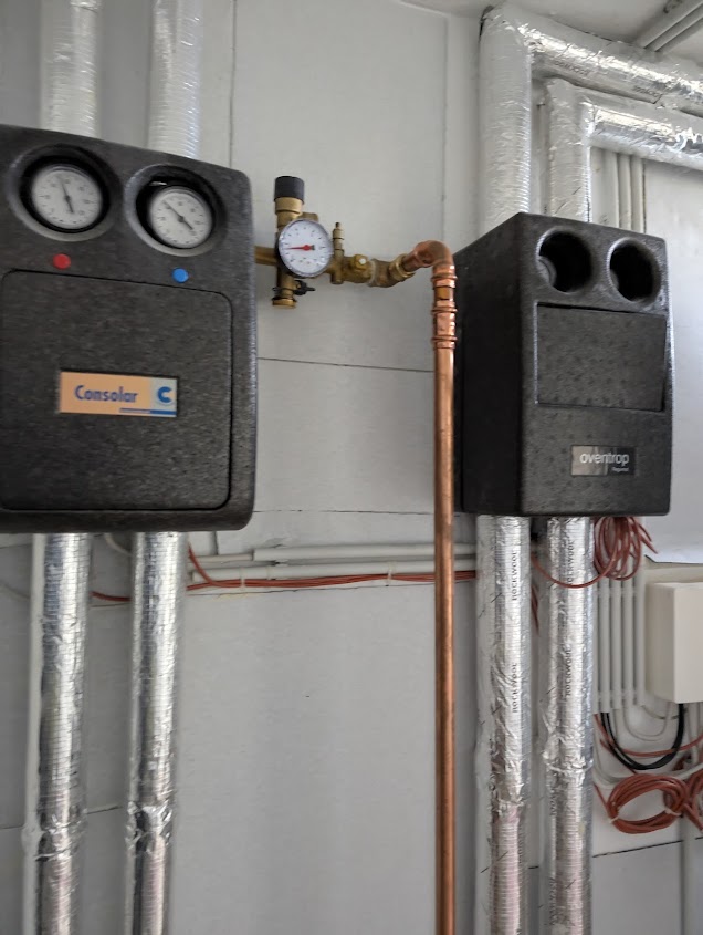Die über Röhrenkollektoren "eingesammelte" Sonnenwärme wird in Wasserspeichern zwischengespeichert und entsprechend dem Wärmebedarf des Büros der Heizung zur Verfügung gestellt. Falls die Wärme nicht ausreicht, wird eine Luftwärmepumpe dazugeschaltet.