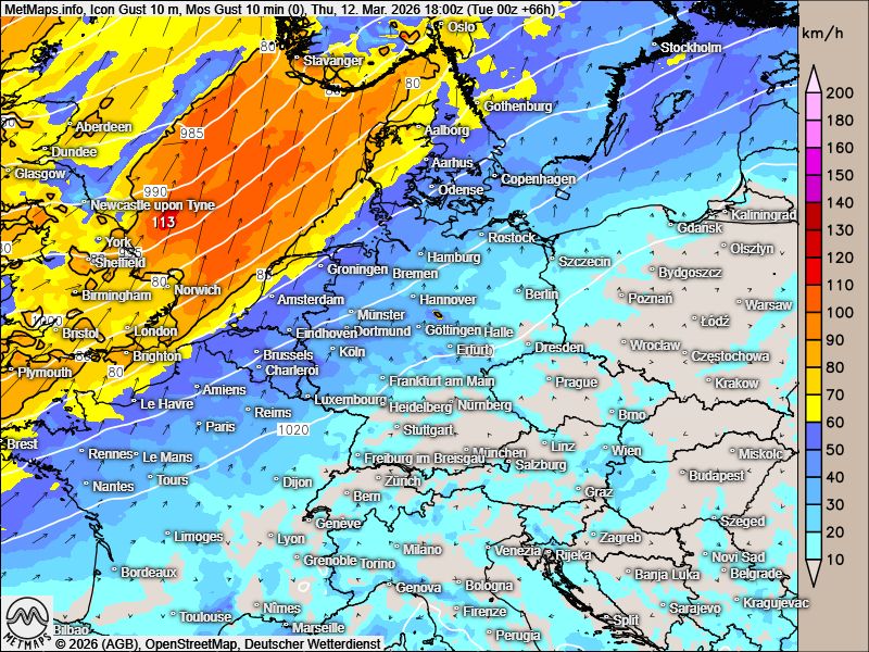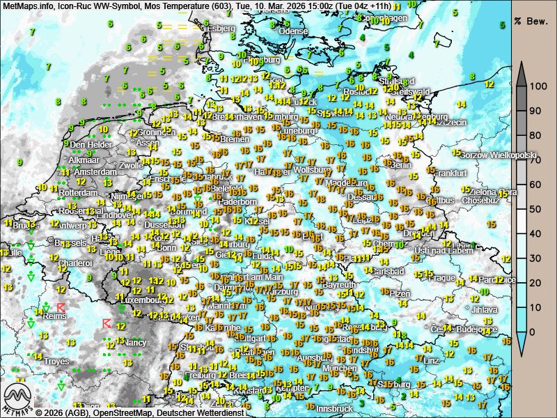 Die Wetter- / Temperaturkarte für Dienstagnachmittag, die 12-Stunden-Regenmengen bis Dienstagabend (18:00 Uhr) sowie die Böenkarte für Donnerstagabend nach ICON: