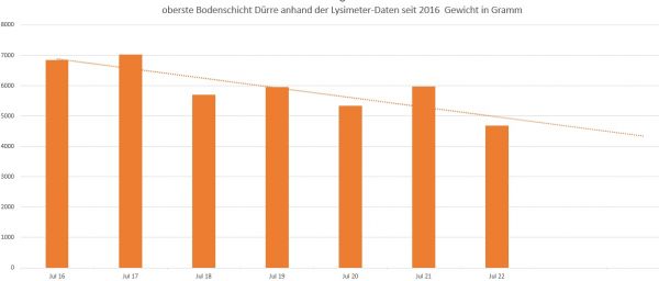 Wie unsere Grafik zeigt, ist das Lysimetergewicht in den Julimonaten an unserer Messstation in Bonn seit sechs Jahren rückläufig: