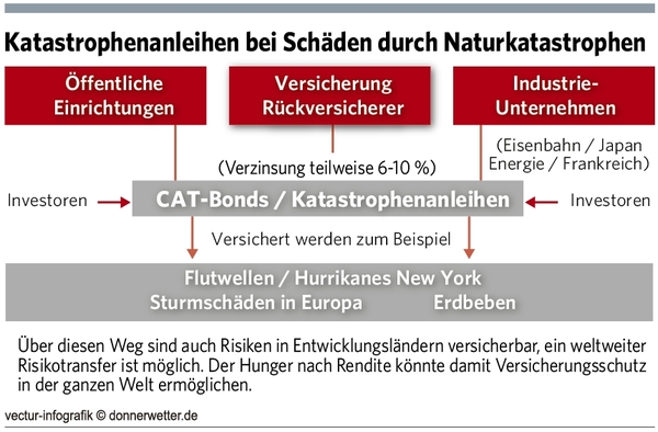 In unserer heutigen Infographik möchten wir Ihnen Katastrophen-Bonds vorstellen. Diese können helfen, Naturkatastrophen von Erdbeben bis hin zu Stürmen abzusichern. Dabei wird z.B. das Risiko einer Flutwelle in New York versichert. Die Investoren geben Geld, welches im Falle einer ruhigen Hurrikanesaison hoch verzinst wird (6-10 %). Trifft aber ein Hurrikane die Stadt und richtet Schäden an, ist das Geld der Investoren weg. Das interessante an Katastrophenbonds ist, dass sie nicht mit dem Anleihen- oder Aktienmarkt korrelieren und somit eine interessante Beimischung für große Investoren sind. Der Ausbau von Katastrophenbonds könnte helfen, Schadenschutz auch in Entwicklungsländern aufzubauen und die ungleich verteilten Risiken in der Welt abszusichern.