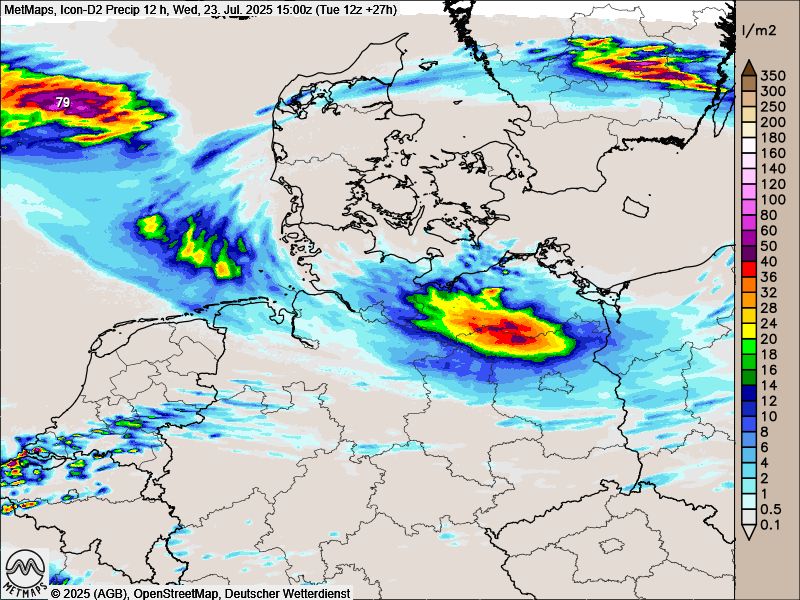 Die Karte zeigt die akkumulierten 12-Stunden-Regenmengen nach ICON (bis Mittwochnachmittag, 15:00 Uhr):