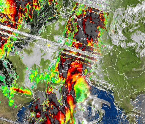 Heftige Unwetter toben über Italien. Bis zu 5 Tote wurden in den letztten 24 Stunden Opfer der Unwetter. Im MIttelmeerraum müssen wir in den nächsten 2 Tagen mit weiteren Gewitterstürmen rechnen. Das Satbild zeigt die Gewitterwolken an der roten Färbung an.