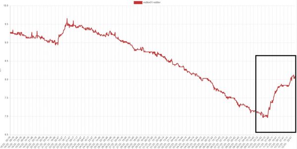 Die folgende Grafik zeigt der Pegelverlauf des Miesbachs zwischen dem 18.02. und 14.03.2024 - schwarz eingerahmt ist der Pegelanstieg in der ersten Wochenhälfte. Die Niederschläge haben hier lediglich für einen Pegelanstieg von gut einem Zentimeter gesorgt.