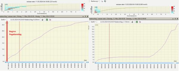 Über den 11. März fielen die insgesamt 35 l/m² verteilt über den gesamten Tag, somit blieb genug Zeit für die Ableitung des Regenwassers. Die Pegelkurve des Miesbachs befand sich bereits ab 23 Uhr (10. März) im Aufwind.
