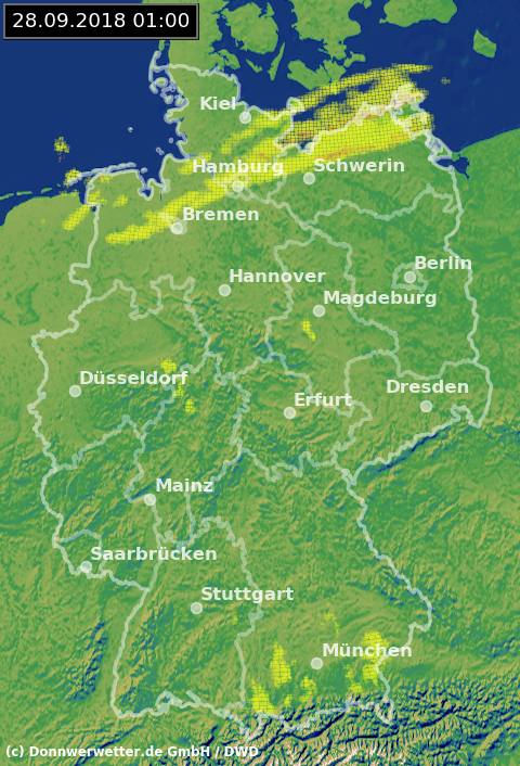 Das Radarbild zeigt aktuell eine schmale Zone mit schwachen Signalen, die von der Ostsee bis westlich nach Bremen reicht. Sie gehört zu der schwachen Kaltfront, die den Norden unseres Landes erreicht hat. In diesem Bereich fällt etwas Regen oder Sprühregen. Sonst präsentiert sich der Himmel ganz im Norden Deutschlands meistens wolkenverhangen, im übrigen Bereich verbreitet sternenklar oder nur gering bewölkt.