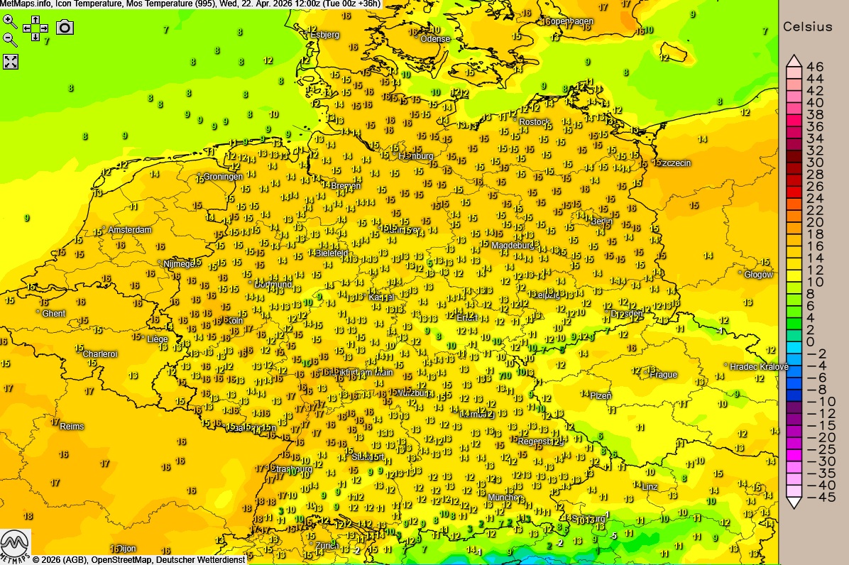 Die Wetter- und Temperaturkarte für Mittwochmittag (12:00 Uhr) nach ICON: