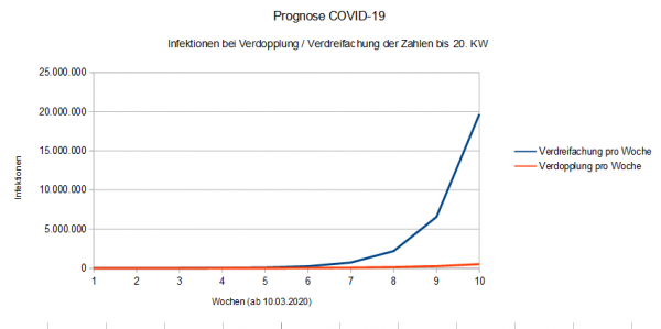 So weit sind wir in Deutschland zum Glück noch nicht, in einem kleinen Modell möchten wir an dieser Stelle aber mal grafisch verdeutlichen, was eine Verdopplung bzw. Verdreifachung der Infiziertenzahlen in Deutschland pro Woche bedeuten würde. Zu Grunde liegt den Berechnungen die aktuelle, leicht auf 1.000 infizierte Personen abgerundete Zahl der bestätigten Coronafälle (Stand: 10.03.2020).
