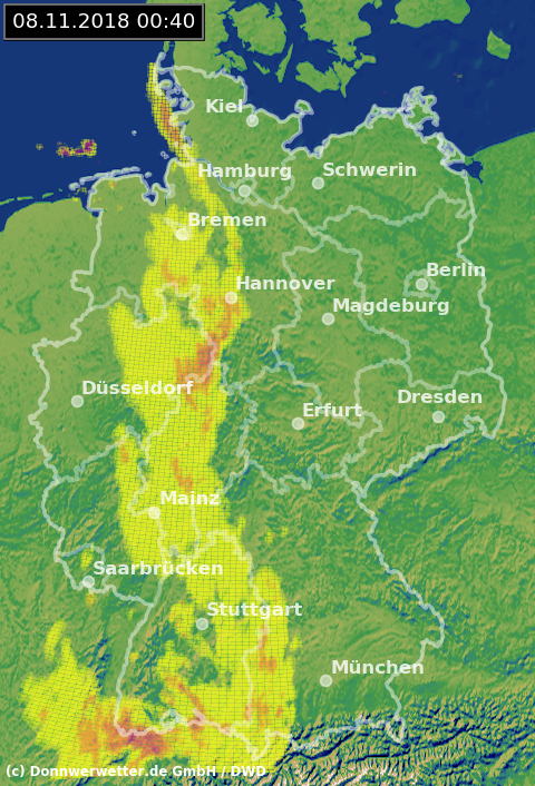 Am Samstag erreicht uns von Westen ein intensiveres Regengebiet. Die Niederschlagsmengen liegen dabei allgemein zwischen 1 und 15 Liter pro Quadratmeter. Trocken bleibt es voraussichtlich nur ganz im Osten, sowie im südöstlichen Bayern.