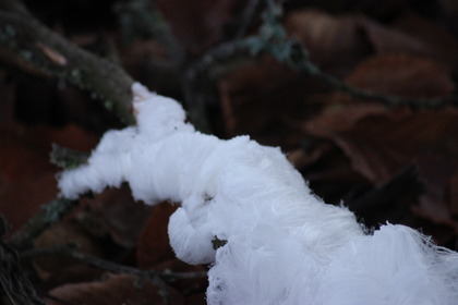 In diesem Dezembertagen findet sich auf vielen Holzstückchen auf Wegen, am Waldrand und Wiesen plötzlich Eis, obwohl es in der Nacht kaum oder nur wenig Reif gab. Die Prozesse bei der Bildung von sogenanntem Haareis oder Eiswolle sind noch nicht völlig entschlüsselt, denn nur auf totem Holz und bestimmten Frost- und Feuchtebedingungen bildet sich das Eis, wie auf unseren Photos am Donnerwetter.de Wetterpark. Der aktuelle Stand des Wissens ist, dass Pilze im inneren des Holzes Feuchtigkeit nach Außen abgeben, die dann an der Oberfläche gefriert. Es bildet sich Eis, welches mit der Zeit, bei weiterer Feuchtigkeitsabgabe weiter wächst. Die Pilze produzieren somit indirekt die Eiswolle auf den Stöcken.