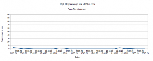 Kein Wunder, es genügt ein einfacher Blick auf die folgende Grafik. Dargestellt sind die täglichen Regensummen im Monat Mai an unserer Wetterstation in Bonn. Bis zum 27.05. fielen hier armselige 13,5 mm Niederschlag. In den verbleibenden vier Maitagen wird sich kein neuer Regen hinzugesellen.