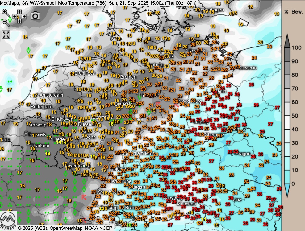 Zu Beginn der neuen Woche geht es weiter bergab, am Montag und Dienstag wird es nochmals deutlich frischer: Am Montag werden bundesweit kaum noch 20 Grad erreicht, am Dienstag steigt das Thermometer vielerorts dann nur noch auf herbstliche 14 bis 17 Grad.