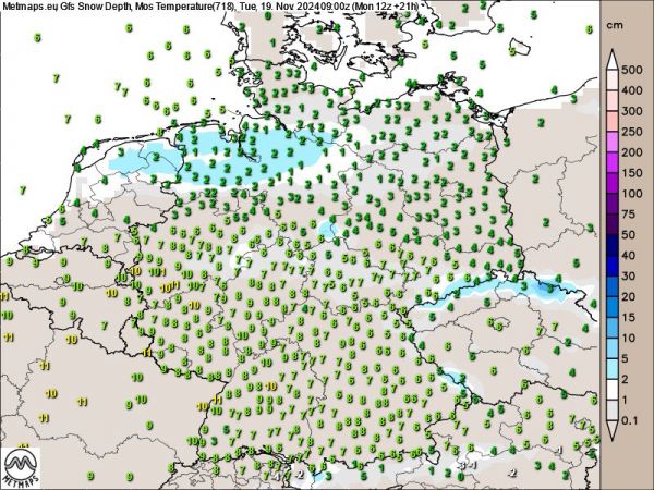Das Frühwetter am Dienstag (09:00 Uhr) nach GFS mit den berechneten Schneehöhen.