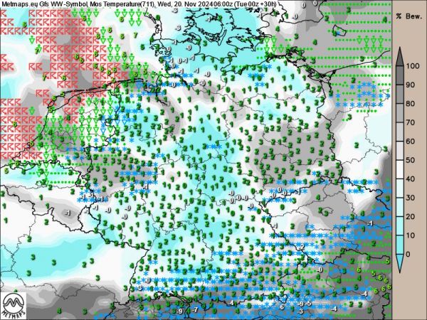 Am Mittwoch bewegen sich die Temperaturen dann verbreitet nur noch im niedrigen einstelligen Plusbereich, in den Mittelgebirgen sind mehrere Zentimeter Neuschnee zu erwarten.