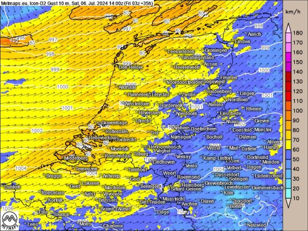 Als beliebtes Reiseziel stehen auch in diesem Jahr wieder die Niederlande hoch im Kurs; wer an diesem Wochenende in Richtung Holland aufbricht, sollte jedoch eine gewisse Sturmfestigkeit mit sich bringen. Und bei Campingurlauben das Zelt am besten doppelt und dreifach im Boden verankern. Denn während bei uns morgen an einer Kaltfront ab und an mal ein paar stürmische Böen durchziehen können, bekommen die Niederlande am Samstag die volle Windpackung ab -  den ganzen Tag über ist hier mit Böen bis 90, vielleicht sogar 100 km/h zu rechnen.