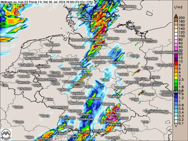 Die Karte zeigt die nach ICON zu erwartenden 1-Stunden-Niederschlagsmengen bis Samstag 16:00 Uhr. Vor allem in Bayern können bei schweren Gewittern hohe Regensummen in kurzer Zeit zusammenkommen.
