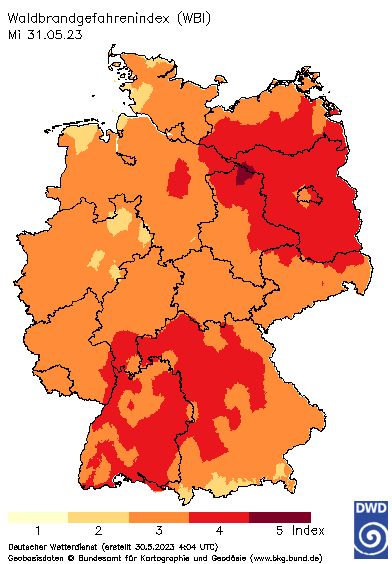 In Sachen Waldbrandgefahr sieht es nur bedingt besser aus - weiterhin im Fokus steht hier der von großer Trockenheit betroffene Osten und Nordosten des Landes. Hier gilt verbreitet die zweithöchste Warnstufe. Aber auch in weiten Teilen Bayerns und Baden-Württembergs besteht ein hohes Waldbrandrisiko.