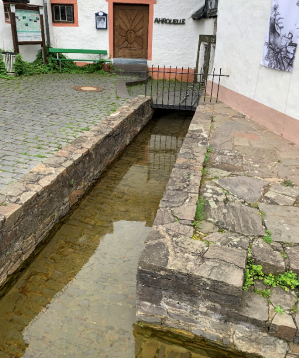 Trotz weniger Kilometer Länge erreichte der Fluss, der an dieser Stelle aktuell nur ca. 20 cm hoch ist, hier schon Pegelstände zwischen 200 und 300 cm. Ahrhütte war somit der erste Ort, der im Rahmen der Ahrflut von erheblichen Schäden an Gebäuden und Infrastruktur betroffen war.
