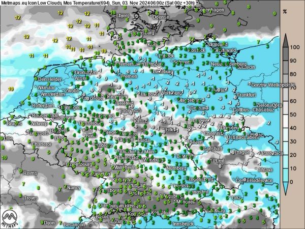 Die Karte zeigt die Verteilung tiefer Wolken sowie die prognostizierten Lufttemperaturen am 03.11.2024 (06:00 Uhr) nach Icon.